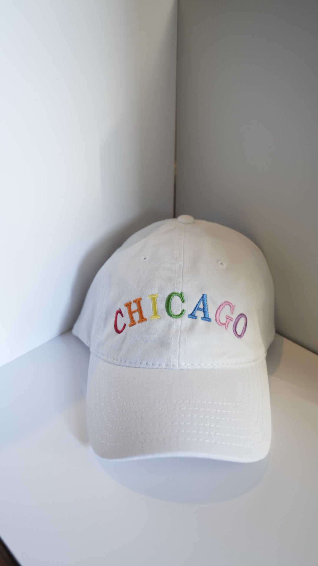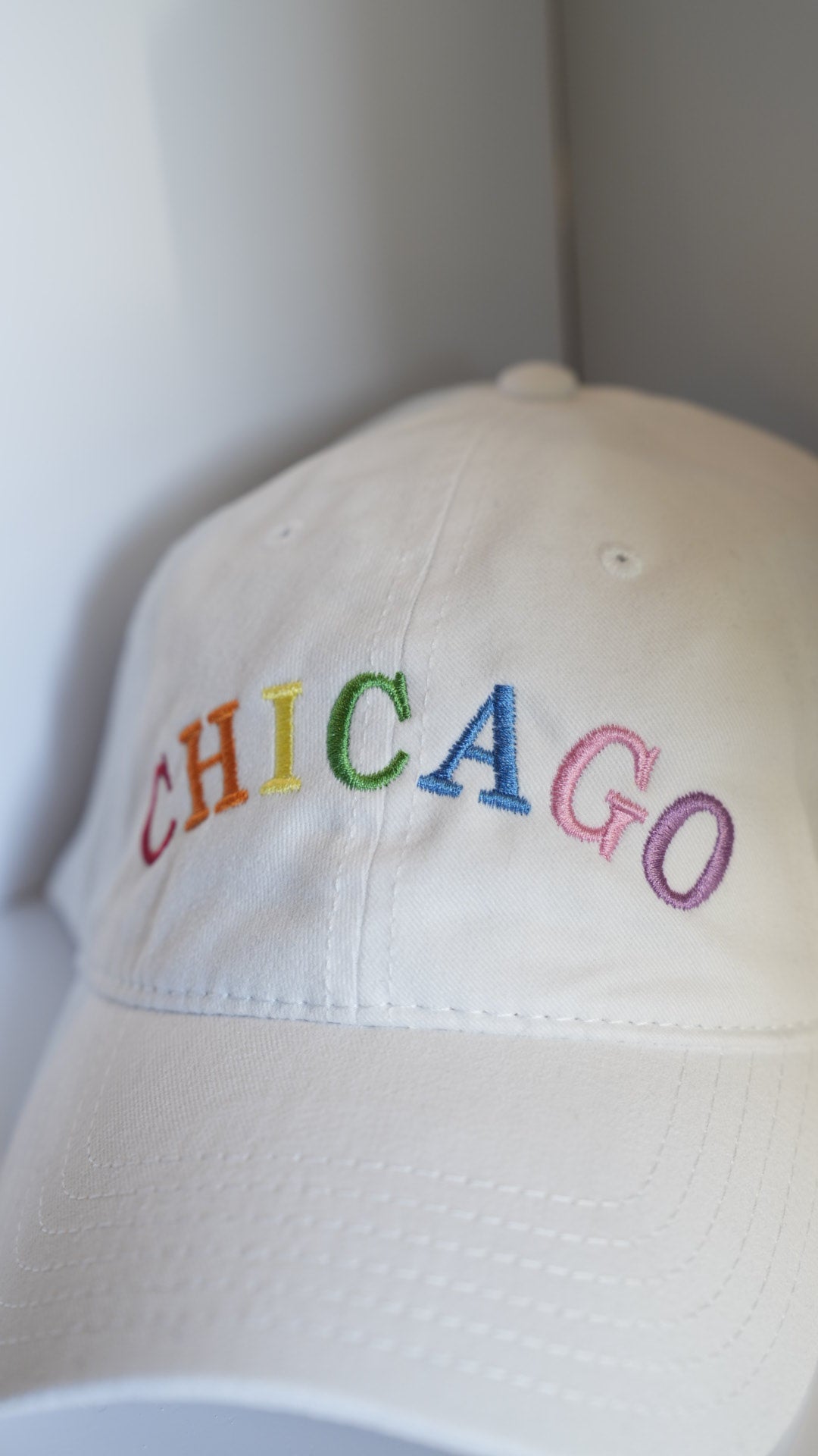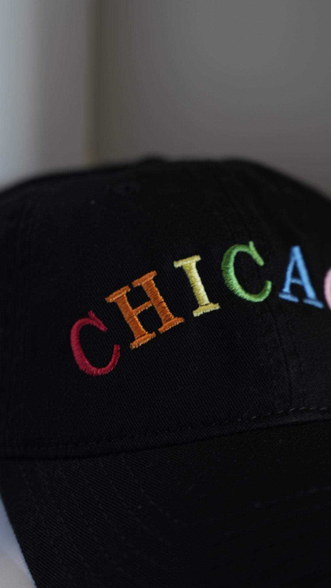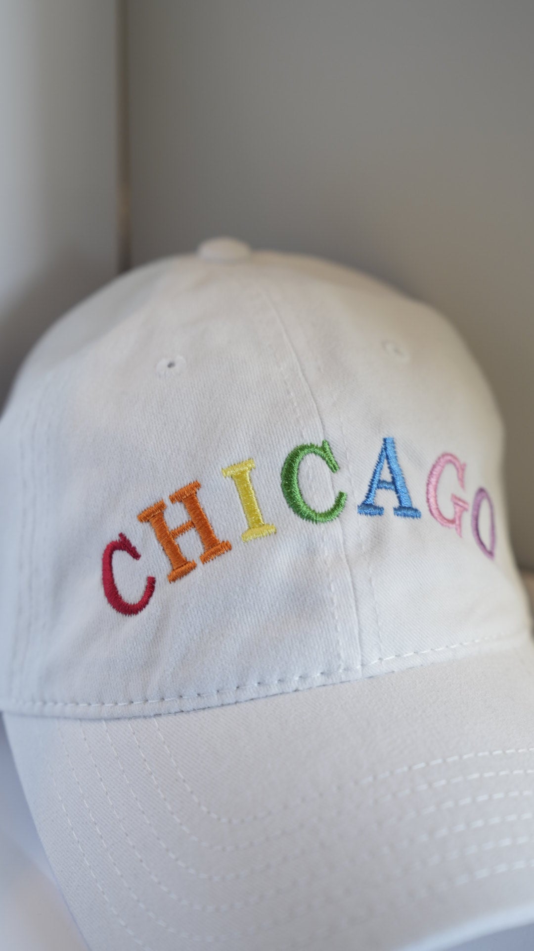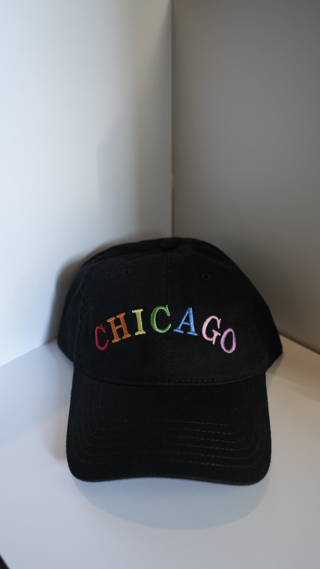 Embroidered text "CHICAGO" with each letter a new color of the rainbow