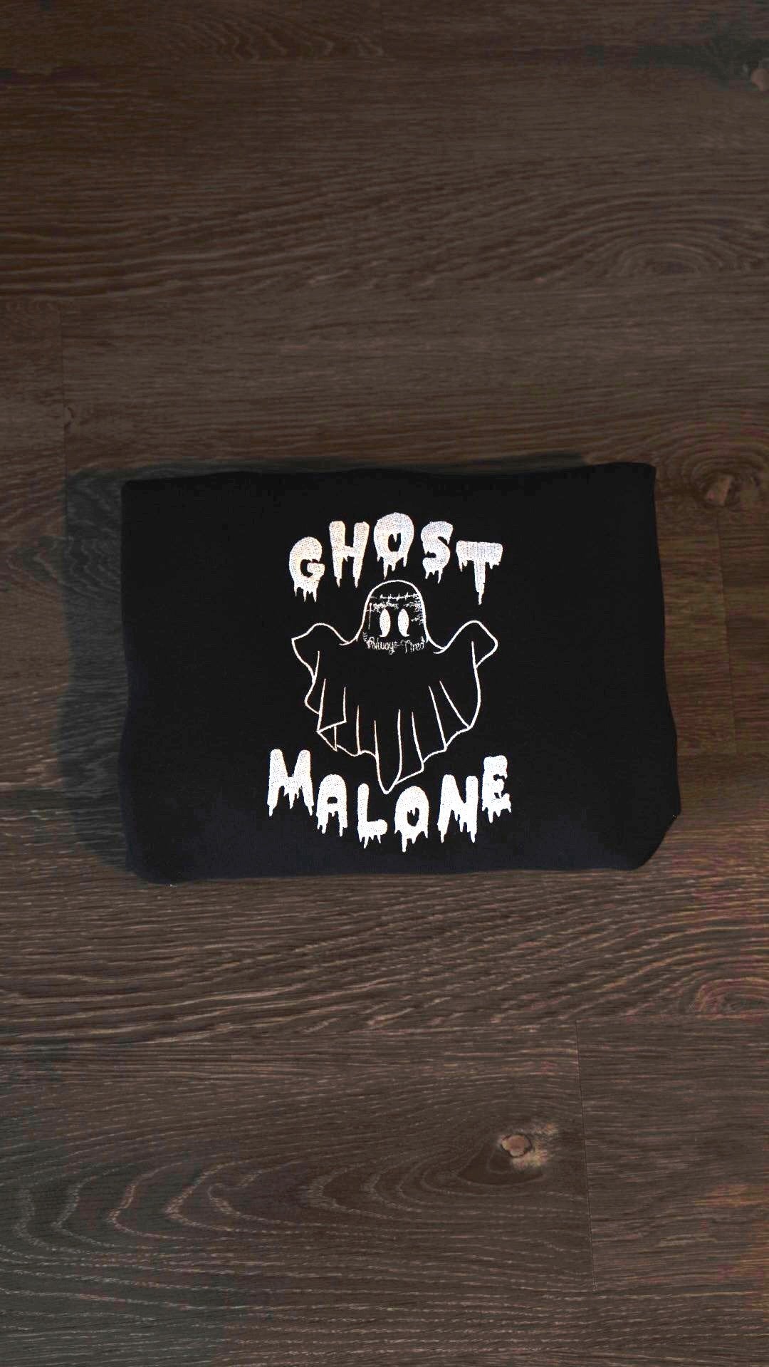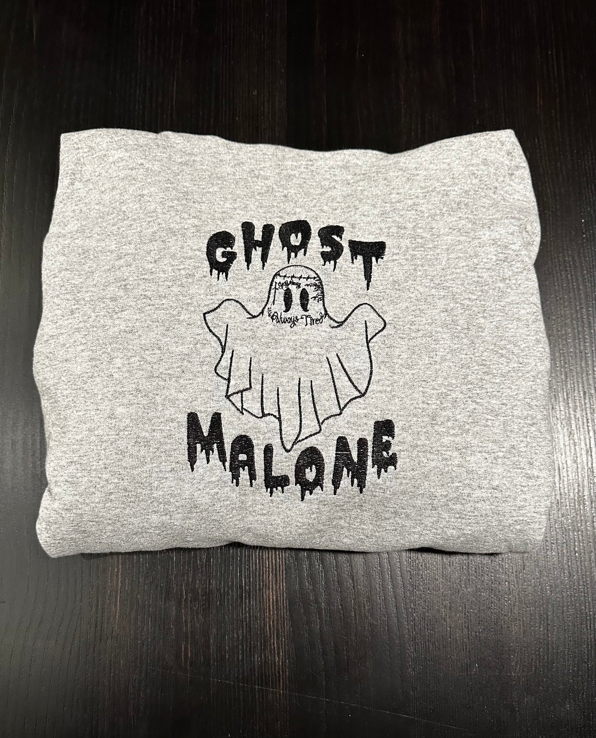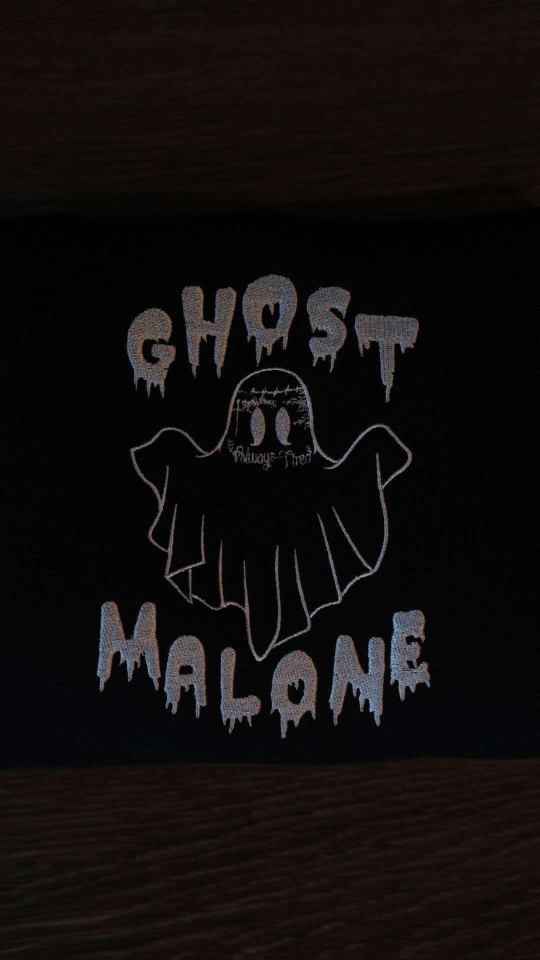 “Ghost Malone” text embroidered in drip font with a ghost in the center of the text with Post Malone’s facial tattoos