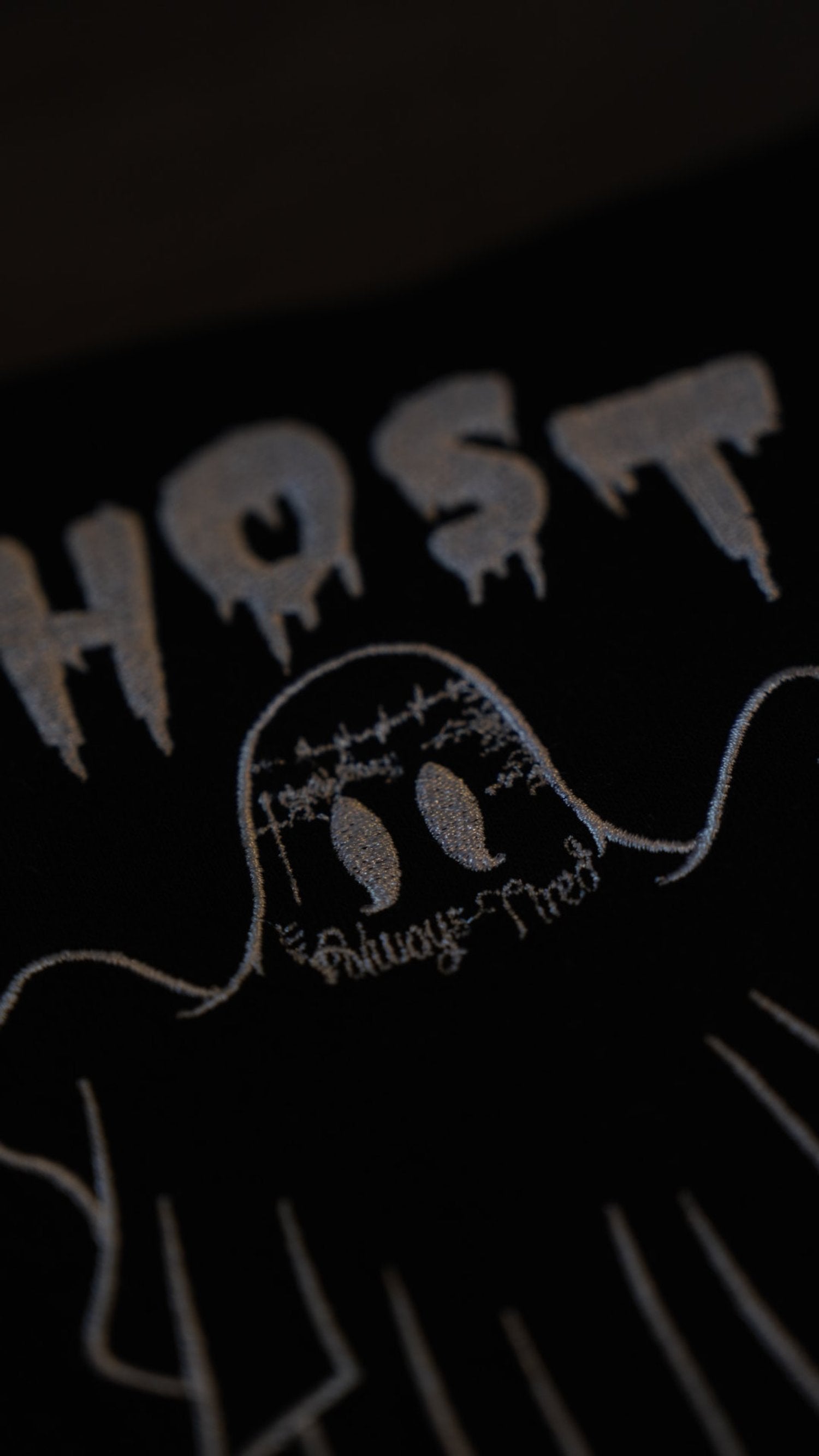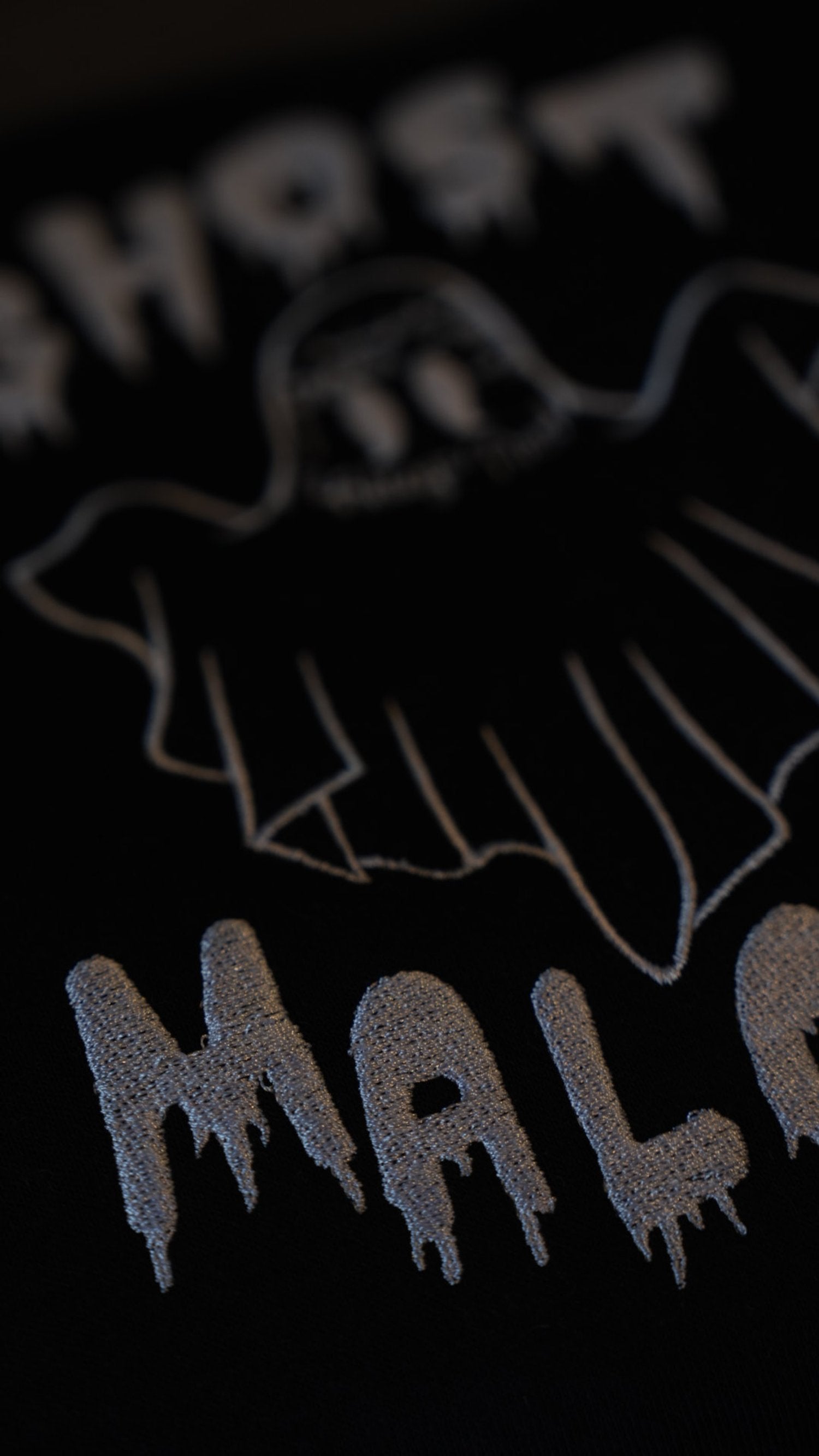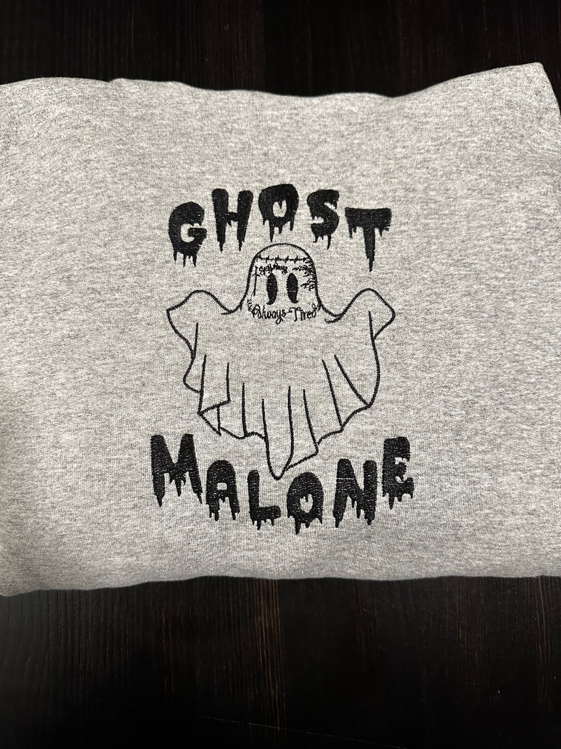 “Ghost Malone” text embroidered in drip font with a ghost in the center of the text with Post Malone’s facial tattoos