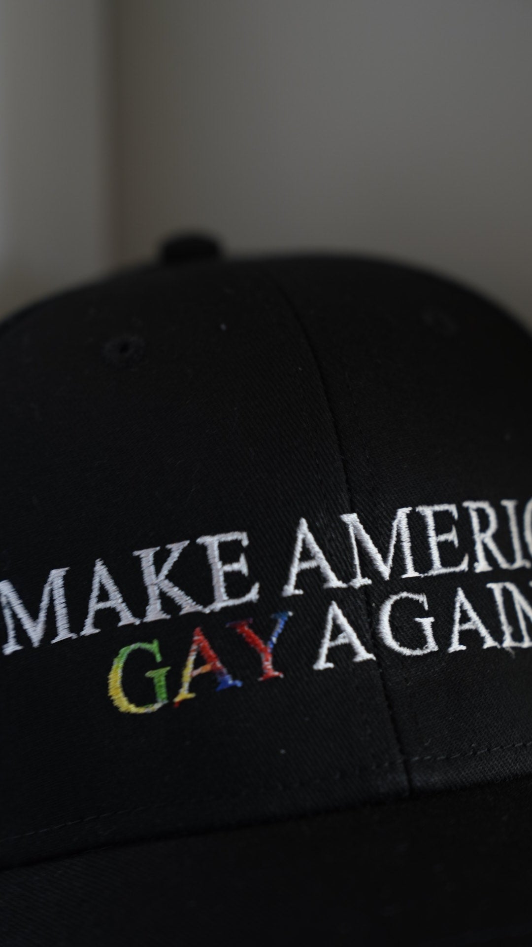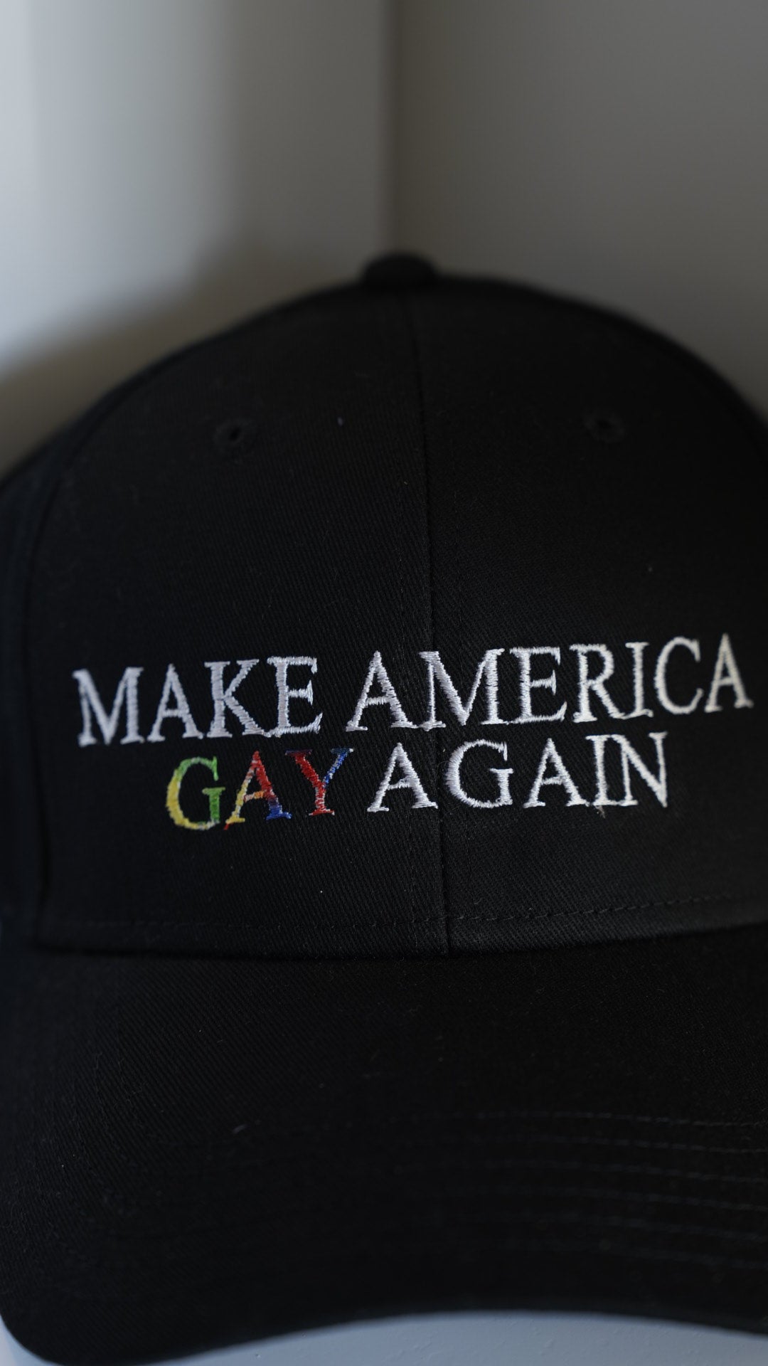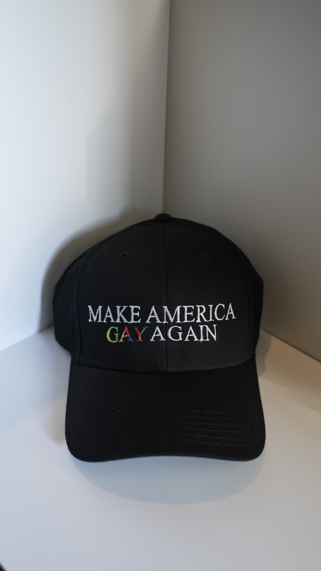 Black hat with white embroidery and "gay" in rainbow embroidery thread